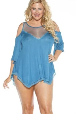 Lusturous Charmeuse and scalloped cut out lace Chemise with open low back and criss cross adjustable shoulder straps. Colors: Hot Pink/Black, Peacock Blue/Black. Sizes: S-M-L-XL. Also available in Plus Sizes.