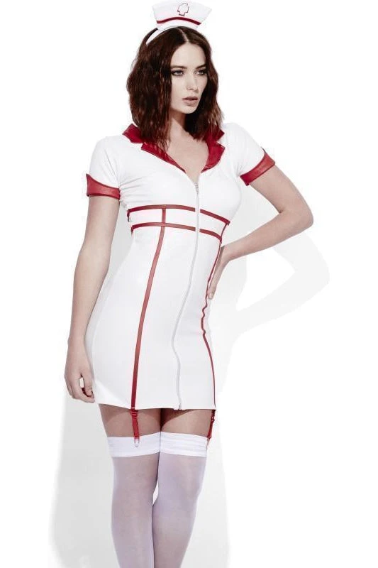 Fever Role-Play Nurse Wet Look Costume White with Dress Detachable Suspenders & Headpiece