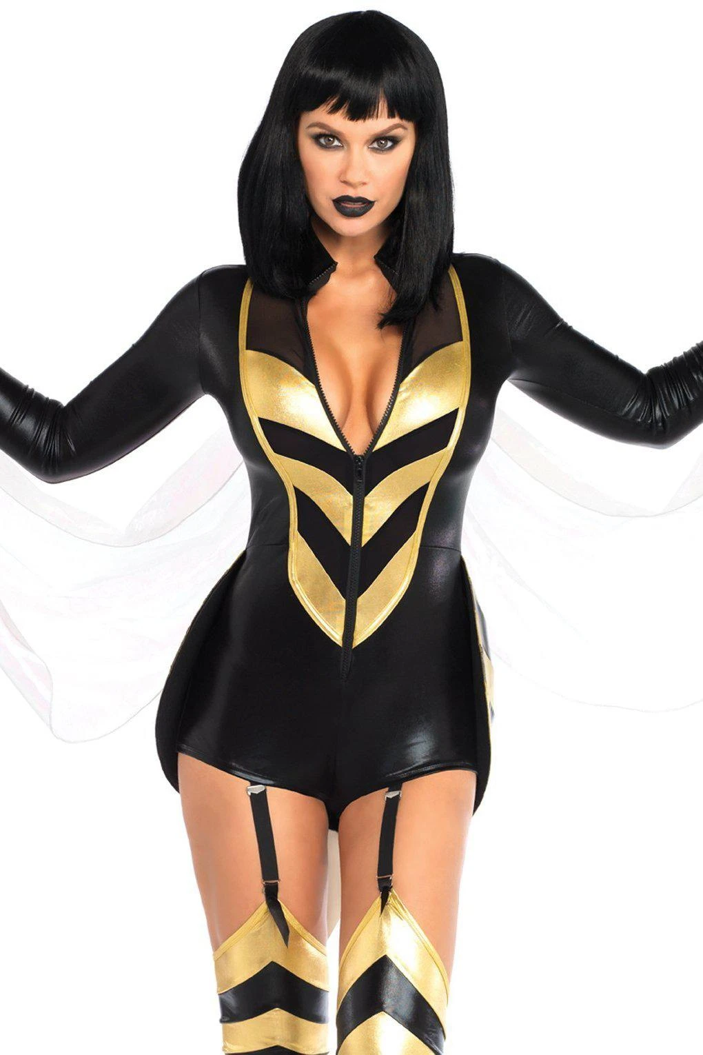 Leg Avenue 2 PC Hornet Honey, includes wet look zipper front garter bodysuit with foam stinger, attached iridescent wings, and matching thigh highs.