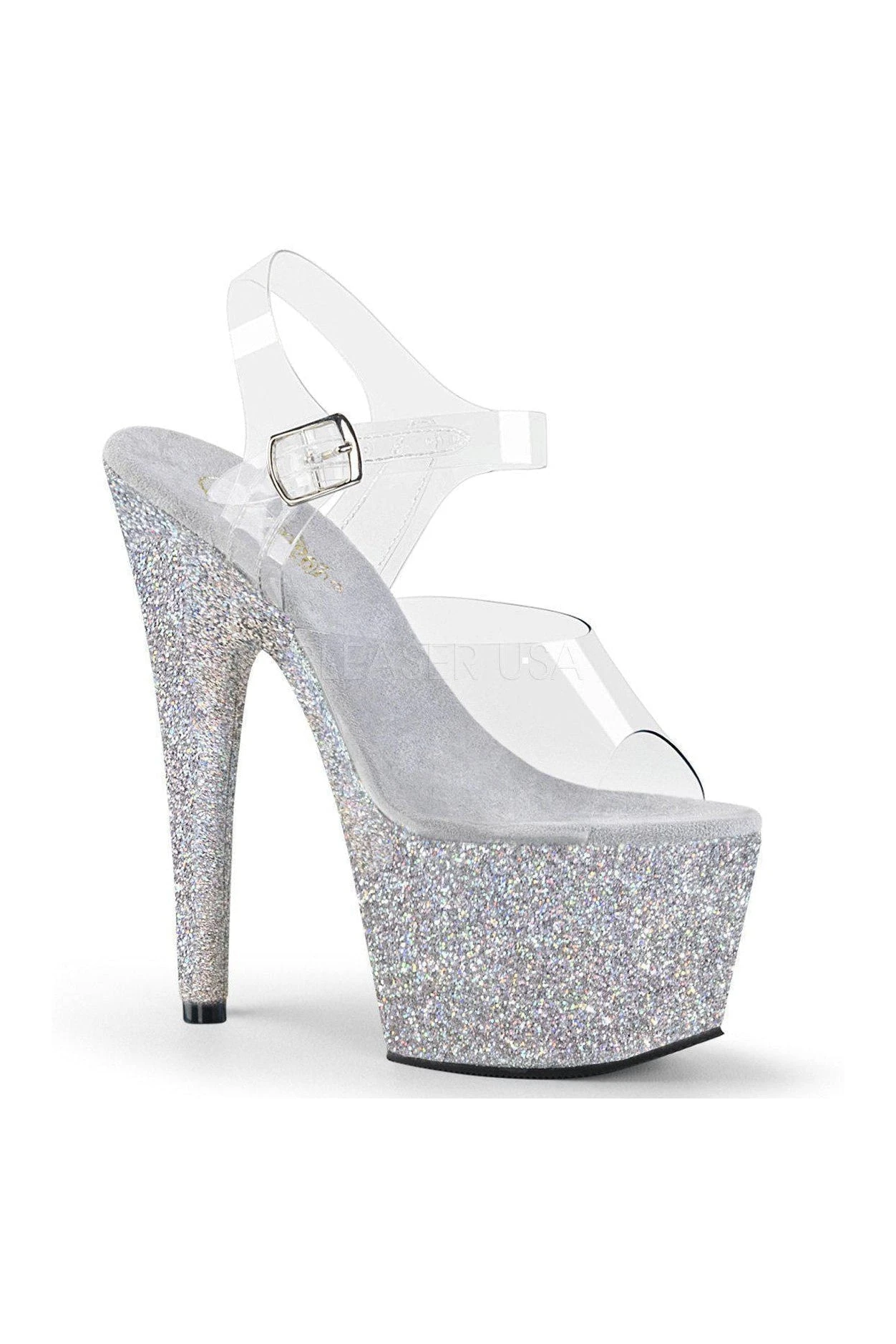 7″ (178mm) Heel, 2 3/4″ (70mm) Platform Ankle Strap Sandal Featuring Holographic Mini Glitter Wrapped Platform Bottom
