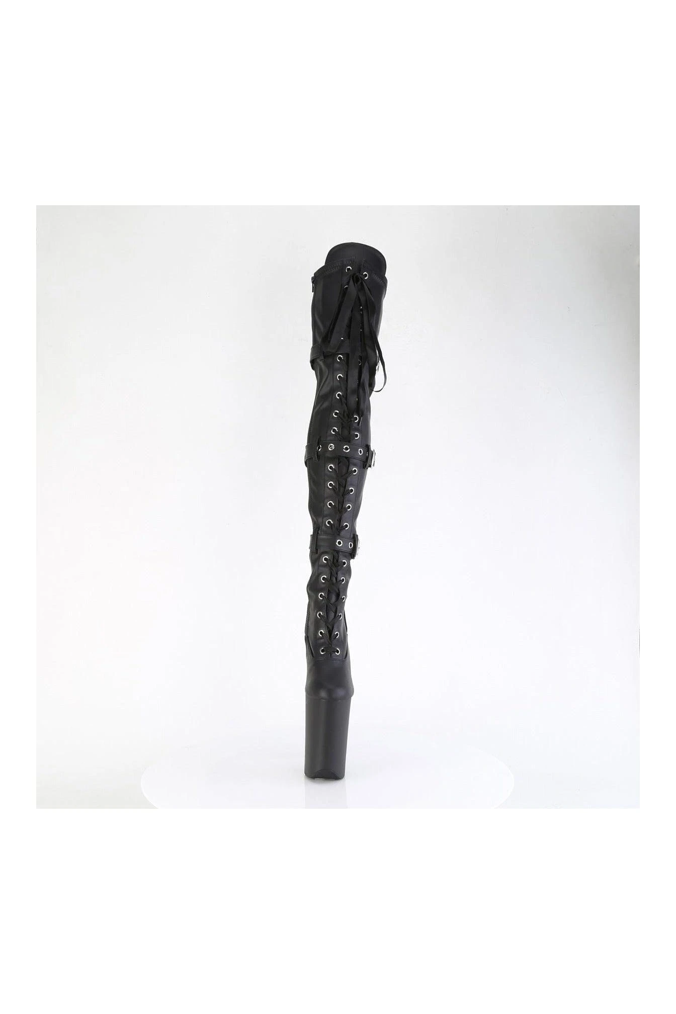 9″ Heel, 5 1/4″ Platform Buckled Lace Up Thigh Boot, Side Zipper